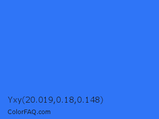Yxy 20.019,0.18,0.148 Color is a normal blue color and the nearest color is Blue Crayola #1f75fe. Hex code #2f75f7 and RGB value is rgb(47,117,247). In RGB color space, this color is composed of 18% red, 46% green, 97% blue, In CMYK color space, this color is composed of 81% cyan, 53% magenta, 0% yellow , 3% black , In HSL color space, this color has a hue angle of 219° , 93% saturation and 58% lightness.