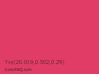 Yxy 20.019,0.502,0.29 Color is a normal red color and the nearest color is Paradise Pink #e63e62. Hex code #e03c65 and RGB value is rgb(224,60,101). In RGB color space, this color is composed of 88% red, 24% green, 40% blue, In CMYK color space, this color is composed of 0% cyan, 73% magenta, 55% yellow , 12% black , In HSL color space, this color has a hue angle of 345° , 73% saturation and 56% lightness.