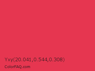 Yxy 20.041,0.544,0.308 Color is a normal red color and the nearest color is Desire #ea3c53. Hex code #e63650 and RGB value is rgb(230,54,80). In RGB color space, this color is composed of 90% red, 21% green, 31% blue, In CMYK color space, this color is composed of 0% cyan, 77% magenta, 65% yellow , 10% black , In HSL color space, this color has a hue angle of 351° , 78% saturation and 56% lightness.