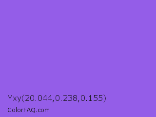 Yxy 20.044,0.238,0.155 Color is a light violet color and the nearest color is Navy Purple #9457eb. Hex code #945de8 and RGB value is rgb(148,93,232). In RGB color space, this color is composed of 58% red, 36% green, 91% blue, In CMYK color space, this color is composed of 36% cyan, 60% magenta, 0% yellow , 9% black , In HSL color space, this color has a hue angle of 264° , 75% saturation and 64% lightness.