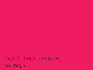 Yxy 20.063,0.533,0.28 Color is a normal rose color and the nearest color is Razzmatazz #e3256b. Hex code #ef1c62 and RGB value is rgb(239,28,98). In RGB color space, this color is composed of 94% red, 11% green, 38% blue, In CMYK color space, this color is composed of 0% cyan, 88% magenta, 59% yellow , 6% black , In HSL color space, this color has a hue angle of 340° , 87% saturation and 52% lightness.