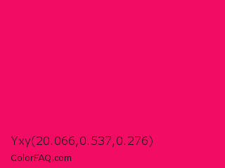 Yxy 20.066,0.537,0.276 Color is a normal rose color and the nearest color is Raspberry #e30b5d. Hex code #f20c63 and RGB value is rgb(242,12,99). In RGB color space, this color is composed of 95% red, 5% green, 39% blue, In CMYK color space, this color is composed of 0% cyan, 95% magenta, 59% yellow , 5% black , In HSL color space, this color has a hue angle of 337° , 91% saturation and 50% lightness.