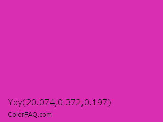 Yxy 20.074,0.372,0.197 Color is a normal magenta color and the nearest color is Frostbite #e936a7. Hex code #da2eb2 and RGB value is rgb(218,46,178). In RGB color space, this color is composed of 85% red, 18% green, 70% blue, In CMYK color space, this color is composed of 0% cyan, 79% magenta, 18% yellow , 15% black , In HSL color space, this color has a hue angle of 314° , 70% saturation and 52% lightness.