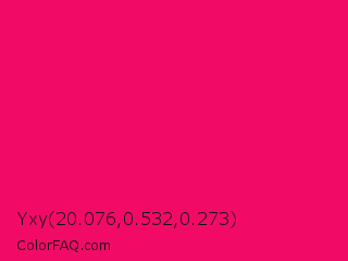 Yxy 20.076,0.532,0.273 Color is a normal rose color and the nearest color is Raspberry #e30b5d. Hex code #f20b66 and RGB value is rgb(242,11,102). In RGB color space, this color is composed of 95% red, 4% green, 40% blue, In CMYK color space, this color is composed of 0% cyan, 95% magenta, 58% yellow , 5% black , In HSL color space, this color has a hue angle of 336° , 91% saturation and 50% lightness.