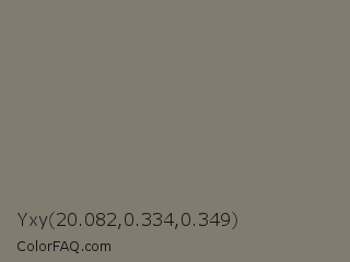 Yxy 20.082,0.334,0.349 Color is a normal orange color and the nearest color is Makara #897d6d. Hex code #827b70 and RGB value is rgb(130,123,112). In RGB color space, this color is composed of 51% red, 48% green, 44% blue, In CMYK color space, this color is composed of 0% cyan, 5% magenta, 14% yellow , 49% black , In HSL color space, this color has a hue angle of 37° , 7% saturation and 47% lightness.