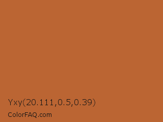Yxy 20.111,0.5,0.39 Color is a normal orange color and the nearest color is Tuscany #bd5e2e. Hex code #bb6533 and RGB value is rgb(187,101,51). In RGB color space, this color is composed of 73% red, 40% green, 20% blue, In CMYK color space, this color is composed of 0% cyan, 46% magenta, 73% yellow , 27% black , In HSL color space, this color has a hue angle of 22° , 57% saturation and 47% lightness.