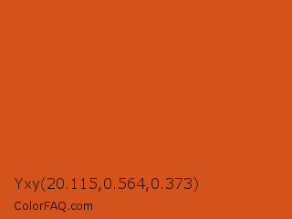 Yxy 20.115,0.564,0.373 Color is a normal orange color and the nearest color is Flame #e25822. Hex code #d4521c and RGB value is rgb(212,82,28). In RGB color space, this color is composed of 83% red, 32% green, 11% blue, In CMYK color space, this color is composed of 0% cyan, 61% magenta, 87% yellow , 17% black , In HSL color space, this color has a hue angle of 18° , 77% saturation and 47% lightness.
