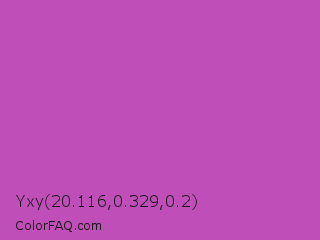 Yxy 20.116,0.329,0.2 Color is a normal magenta color and the nearest color is Fuchsia Pink #c154c1. Hex code #c04eb8 and RGB value is rgb(192,78,184). In RGB color space, this color is composed of 75% red, 31% green, 72% blue, In CMYK color space, this color is composed of 0% cyan, 59% magenta, 4% yellow , 25% black , In HSL color space, this color has a hue angle of 304° , 48% saturation and 53% lightness.