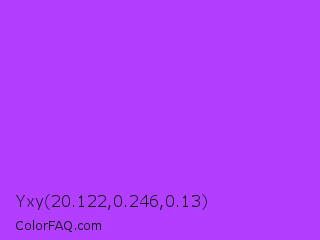 Yxy 20.122,0.246,0.13 Color is a light purple color and the nearest color is Veronica #a020f0. Hex code #b23eff and RGB value is rgb(178,62,255). In RGB color space, this color is composed of 70% red, 24% green, 100% blue, In CMYK color space, this color is composed of 30% cyan, 76% magenta, 0% yellow , 0% black , In HSL color space, this color has a hue angle of 276° , 100% saturation and 62% lightness.