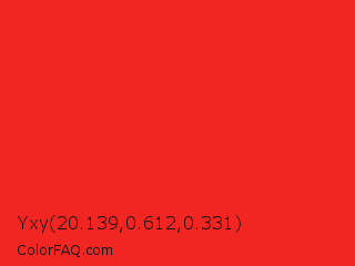 Yxy 20.139,0.612,0.331 Color is a normal red color and the nearest color is Red Pigment #ed1c24. Hex code #f12522 and RGB value is rgb(241,37,34). In RGB color space, this color is composed of 95% red, 15% green, 13% blue, In CMYK color space, this color is composed of 0% cyan, 85% magenta, 86% yellow , 5% black , In HSL color space, this color has a hue angle of 1° , 88% saturation and 54% lightness.