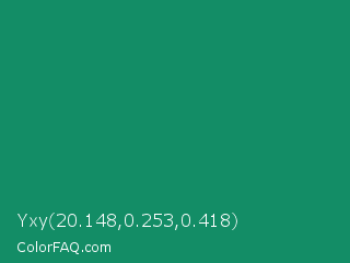 Yxy 20.148,0.253,0.418 Color is a normal green color and the nearest color is Elf Green #088370. Hex code #138d66 and RGB value is rgb(19,141,102). In RGB color space, this color is composed of 7% red, 55% green, 40% blue, In CMYK color space, this color is composed of 87% cyan, 0% magenta, 28% yellow , 45% black , In HSL color space, this color has a hue angle of 161° , 76% saturation and 31% lightness.