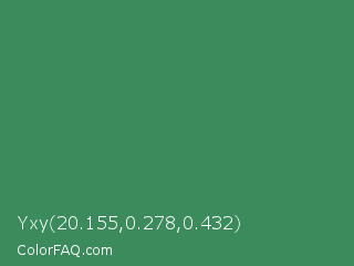 Yxy 20.155,0.278,0.432 Color is a normal green color and the nearest color is Sea Green #2e8b57. Hex code #3b8b5d and RGB value is rgb(59,139,93). In RGB color space, this color is composed of 23% red, 55% green, 36% blue, In CMYK color space, this color is composed of 58% cyan, 0% magenta, 33% yellow , 45% black , In HSL color space, this color has a hue angle of 146° , 40% saturation and 39% lightness.