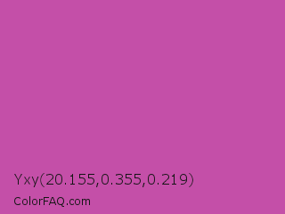 Yxy 20.155,0.355,0.219 Color is a normal magenta color and the nearest color is Fuchsia Pink #c154c1. Hex code #c44fa8 and RGB value is rgb(196,79,168). In RGB color space, this color is composed of 77% red, 31% green, 66% blue, In CMYK color space, this color is composed of 0% cyan, 60% magenta, 14% yellow , 23% black , In HSL color space, this color has a hue angle of 314° , 50% saturation and 54% lightness.