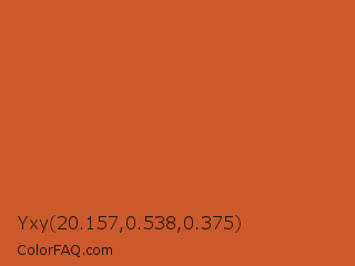 Yxy 20.157,0.538,0.375 Color is a normal orange color and the nearest color is Piper #c96323. Hex code #cc592b and RGB value is rgb(204,89,43). In RGB color space, this color is composed of 80% red, 35% green, 17% blue, In CMYK color space, this color is composed of 0% cyan, 56% magenta, 79% yellow , 20% black , In HSL color space, this color has a hue angle of 17° , 65% saturation and 48% lightness.