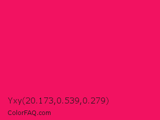 Yxy 20.173,0.539,0.279 Color is a normal rose color and the nearest color is Raspberry #e30b5d. Hex code #f21261 and RGB value is rgb(242,18,97). In RGB color space, this color is composed of 95% red, 7% green, 38% blue, In CMYK color space, this color is composed of 0% cyan, 93% magenta, 60% yellow , 5% black , In HSL color space, this color has a hue angle of 339° , 90% saturation and 51% lightness.