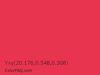 Yxy 20.176,0.548,0.308 Color is a normal red color and the nearest color is Desire #ea3c53. Hex code #e8344f and RGB value is rgb(232,52,79). In RGB color space, this color is composed of 91% red, 20% green, 31% blue, In CMYK color space, this color is composed of 0% cyan, 78% magenta, 66% yellow , 9% black , In HSL color space, this color has a hue angle of 351° , 80% saturation and 56% lightness.