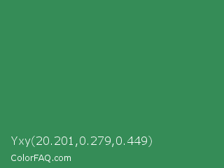 Yxy 20.201,0.279,0.449 Color is a normal green color and the nearest color is Sea Green #2e8b57. Hex code #358c57 and RGB value is rgb(53,140,87). In RGB color space, this color is composed of 21% red, 55% green, 34% blue, In CMYK color space, this color is composed of 62% cyan, 0% magenta, 38% yellow , 45% black , In HSL color space, this color has a hue angle of 143° , 45% saturation and 38% lightness.