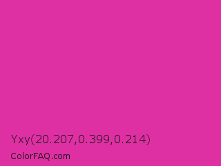 Yxy 20.207,0.399,0.214 Color is a normal magenta color and the nearest color is Frostbite #e936a7. Hex code #de30a3 and RGB value is rgb(222,48,163). In RGB color space, this color is composed of 87% red, 19% green, 64% blue, In CMYK color space, this color is composed of 0% cyan, 78% magenta, 27% yellow , 13% black , In HSL color space, this color has a hue angle of 320° , 73% saturation and 53% lightness.
