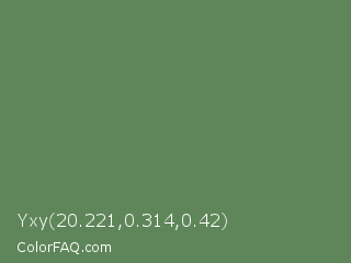 Yxy 20.221,0.314,0.42 Color is a normal green color and the nearest color is Glade Green #61845f. Hex code #5f865a and RGB value is rgb(95,134,90). In RGB color space, this color is composed of 37% red, 53% green, 35% blue, In CMYK color space, this color is composed of 29% cyan, 0% magenta, 33% yellow , 47% black , In HSL color space, this color has a hue angle of 113° , 20% saturation and 44% lightness.