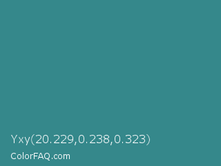 Yxy 20.229,0.238,0.323 Color is a normal cyan color and the nearest color is Lochinvar #2c8c84. Hex code #35888b and RGB value is rgb(53,136,139). In RGB color space, this color is composed of 21% red, 53% green, 55% blue, In CMYK color space, this color is composed of 62% cyan, 2% magenta, 0% yellow , 45% black , In HSL color space, this color has a hue angle of 182° , 45% saturation and 38% lightness.