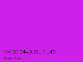 Yxy 20.244,0.291,0.143 Color is a normal magenta color and the nearest color is Vivid Mulberry #b80ce3. Hex code #cf1feb and RGB value is rgb(207,31,235). In RGB color space, this color is composed of 81% red, 12% green, 92% blue, In CMYK color space, this color is composed of 12% cyan, 87% magenta, 0% yellow , 8% black , In HSL color space, this color has a hue angle of 292° , 84% saturation and 52% lightness.