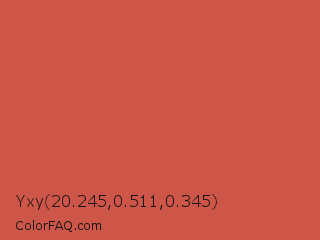 Yxy 20.245,0.511,0.345 Color is a normal red color and the nearest color is Dark Coral #cd5b45. Hex code #ce5648 and RGB value is rgb(206,86,72). In RGB color space, this color is composed of 81% red, 34% green, 28% blue, In CMYK color space, this color is composed of 0% cyan, 58% magenta, 65% yellow , 19% black , In HSL color space, this color has a hue angle of 6° , 58% saturation and 55% lightness.
