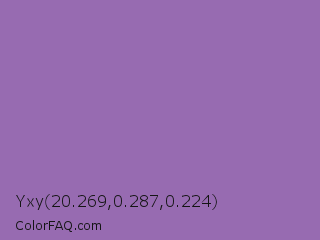Yxy 20.269,0.287,0.224 Color is a normal purple color and the nearest color is Wisteria #9771b5. Hex code #976bb1 and RGB value is rgb(151,107,177). In RGB color space, this color is composed of 59% red, 42% green, 69% blue, In CMYK color space, this color is composed of 15% cyan, 40% magenta, 0% yellow , 31% black , In HSL color space, this color has a hue angle of 278° , 31% saturation and 56% lightness.