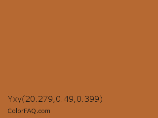 Yxy 20.279,0.49,0.399 Color is a normal orange color and the nearest color is Liver Dogs #b86d29. Hex code #b66932 and RGB value is rgb(182,105,50). In RGB color space, this color is composed of 71% red, 41% green, 20% blue, In CMYK color space, this color is composed of 0% cyan, 42% magenta, 73% yellow , 29% black , In HSL color space, this color has a hue angle of 25° , 57% saturation and 45% lightness.