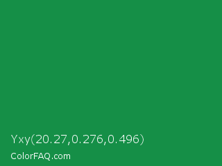Yxy 20.27,0.276,0.496 Color is a normal green color and the nearest color is Salem #097f4b. Hex code #158f47 and RGB value is rgb(21,143,71). In RGB color space, this color is composed of 8% red, 56% green, 28% blue, In CMYK color space, this color is composed of 85% cyan, 0% magenta, 50% yellow , 44% black , In HSL color space, this color has a hue angle of 145° , 74% saturation and 32% lightness.