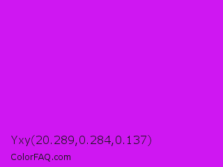 Yxy 20.289,0.284,0.137 Color is a normal purple color and the nearest color is Vivid Orchid #cc00ff. Hex code #cf17f2 and RGB value is rgb(207,23,242). In RGB color space, this color is composed of 81% red, 9% green, 95% blue, In CMYK color space, this color is composed of 14% cyan, 90% magenta, 0% yellow , 5% black , In HSL color space, this color has a hue angle of 290° , 89% saturation and 52% lightness.