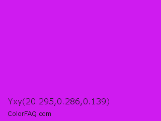 Yxy 20.295,0.286,0.139 Color is a normal purple color and the nearest color is Vivid Mulberry #b80ce3. Hex code #cf1bf0 and RGB value is rgb(207,27,240). In RGB color space, this color is composed of 81% red, 11% green, 94% blue, In CMYK color space, this color is composed of 14% cyan, 89% magenta, 0% yellow , 6% black , In HSL color space, this color has a hue angle of 291° , 88% saturation and 52% lightness.