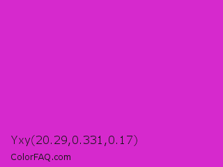 Yxy 20.29,0.331,0.17 Color is a normal magenta color and the nearest color is Steel Pink #cc33cc. Hex code #d629cd and RGB value is rgb(214,41,205). In RGB color space, this color is composed of 84% red, 16% green, 80% blue, In CMYK color space, this color is composed of 0% cyan, 81% magenta, 4% yellow , 16% black , In HSL color space, this color has a hue angle of 303° , 68% saturation and 50% lightness.