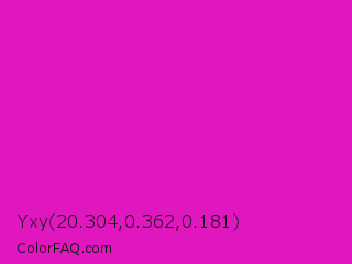 Yxy 20.304,0.362,0.181 Color is a normal magenta color and the nearest color is Shocking Pink #fc0fc0. Hex code #e017bf and RGB value is rgb(224,23,191). In RGB color space, this color is composed of 88% red, 9% green, 75% blue, In CMYK color space, this color is composed of 0% cyan, 90% magenta, 15% yellow , 12% black , In HSL color space, this color has a hue angle of 310° , 81% saturation and 48% lightness.