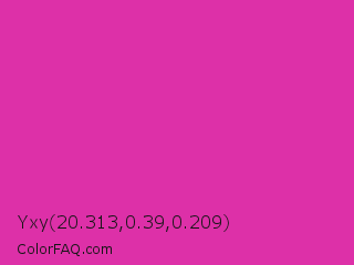 Yxy 20.313,0.39,0.209 Color is a normal magenta color and the nearest color is Frostbite #e936a7. Hex code #dd30a8 and RGB value is rgb(221,48,168). In RGB color space, this color is composed of 87% red, 19% green, 66% blue, In CMYK color space, this color is composed of 0% cyan, 78% magenta, 24% yellow , 13% black , In HSL color space, this color has a hue angle of 318° , 72% saturation and 53% lightness.