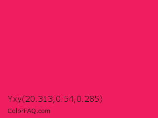 Yxy 20.313,0.54,0.285 Color is a normal rose color and the nearest color is Red Crayola #ee204d. Hex code #f01e5e and RGB value is rgb(240,30,94). In RGB color space, this color is composed of 94% red, 12% green, 37% blue, In CMYK color space, this color is composed of 0% cyan, 88% magenta, 61% yellow , 6% black , In HSL color space, this color has a hue angle of 342° , 88% saturation and 53% lightness.