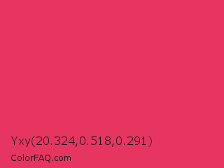 Yxy 20.324,0.518,0.291 Color is a normal red color and the nearest color is Paradise Pink #e63e62. Hex code #e63561 and RGB value is rgb(230,53,97). In RGB color space, this color is composed of 90% red, 21% green, 38% blue, In CMYK color space, this color is composed of 0% cyan, 77% magenta, 58% yellow , 10% black , In HSL color space, this color has a hue angle of 345° , 78% saturation and 55% lightness.