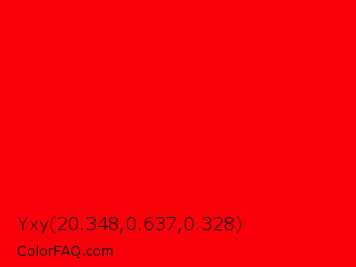 Yxy 20.348,0.637,0.328 Color is a normal red color and the nearest color is Red #ff0000. Hex code #fa000b and RGB value is rgb(250,0,11). In RGB color space, this color is composed of 98% red, 0% green, 4% blue, In CMYK color space, this color is composed of 0% cyan, 100% magenta, 96% yellow , 2% black , In HSL color space, this color has a hue angle of 357° , 100% saturation and 49% lightness.