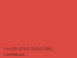 Yxy 20.374,0.543,0.336 Color is a normal red color and the nearest color is Valencia #d84437. Hex code #dc4942 and RGB value is rgb(220,73,66). In RGB color space, this color is composed of 86% red, 29% green, 26% blue, In CMYK color space, this color is composed of 0% cyan, 67% magenta, 70% yellow , 14% black , In HSL color space, this color has a hue angle of 3° , 69% saturation and 56% lightness.