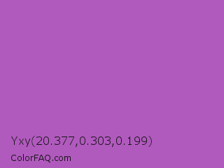 Yxy 20.377,0.303,0.199 Color is a normal magenta color and the nearest color is Fuchsia Pink #c154c1. Hex code #b15abe and RGB value is rgb(177,90,190). In RGB color space, this color is composed of 69% red, 35% green, 75% blue, In CMYK color space, this color is composed of 7% cyan, 53% magenta, 0% yellow , 25% black , In HSL color space, this color has a hue angle of 292° , 43% saturation and 55% lightness.