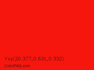 Yxy 20.377,0.631,0.332 Color is a normal red color and the nearest color is Vivid Red #f70d1a. Hex code #f7160d and RGB value is rgb(247,22,13). In RGB color space, this color is composed of 97% red, 9% green, 5% blue, In CMYK color space, this color is composed of 0% cyan, 91% magenta, 95% yellow , 3% black , In HSL color space, this color has a hue angle of 2° , 94% saturation and 51% lightness.