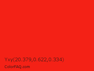 Yxy 20.379,0.622,0.334 Color is a normal red color and the nearest color is Red RYB #fe2712. Hex code #f42116 and RGB value is rgb(244,33,22). In RGB color space, this color is composed of 96% red, 13% green, 9% blue, In CMYK color space, this color is composed of 0% cyan, 86% magenta, 91% yellow , 4% black , In HSL color space, this color has a hue angle of 3° , 91% saturation and 52% lightness.
