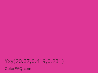 Yxy 20.37,0.419,0.231 Color is a normal magenta color and the nearest color is Cerise #da3287. Hex code #de3696 and RGB value is rgb(222,54,150). In RGB color space, this color is composed of 87% red, 21% green, 59% blue, In CMYK color space, this color is composed of 0% cyan, 76% magenta, 32% yellow , 13% black , In HSL color space, this color has a hue angle of 326° , 72% saturation and 54% lightness.