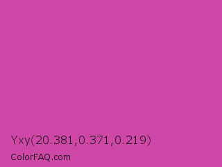 Yxy 20.381,0.371,0.219 Color is a normal magenta color and the nearest color is Pink Pantone #d74894. Hex code #ce47a6 and RGB value is rgb(206,71,166). In RGB color space, this color is composed of 81% red, 28% green, 65% blue, In CMYK color space, this color is composed of 0% cyan, 66% magenta, 19% yellow , 19% black , In HSL color space, this color has a hue angle of 318° , 58% saturation and 54% lightness.
