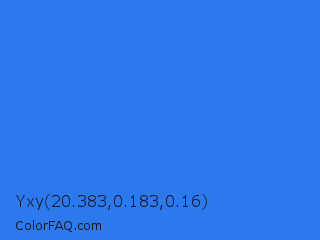 Yxy 20.383,0.183,0.16 Color is a normal blue color and the nearest color is Bleu De France #318ce7. Hex code #2c79ee and RGB value is rgb(44,121,238). In RGB color space, this color is composed of 17% red, 47% green, 93% blue, In CMYK color space, this color is composed of 82% cyan, 49% magenta, 0% yellow , 7% black , In HSL color space, this color has a hue angle of 216° , 85% saturation and 55% lightness.