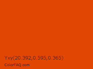 Yxy 20.392,0.595,0.365 Color is a normal orange color and the nearest color is Trinidad #e64e03. Hex code #e14602 and RGB value is rgb(225,70,2). In RGB color space, this color is composed of 88% red, 27% green, 1% blue, In CMYK color space, this color is composed of 0% cyan, 69% magenta, 99% yellow , 12% black , In HSL color space, this color has a hue angle of 18° , 98% saturation and 45% lightness.