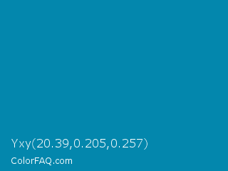 Yxy 20.39,0.205,0.257 Color is a normal cyan color and the nearest color is Blue Munsell #0093af. Hex code #0387ad and RGB value is rgb(3,135,173). In RGB color space, this color is composed of 1% red, 53% green, 68% blue, In CMYK color space, this color is composed of 98% cyan, 22% magenta, 0% yellow , 32% black , In HSL color space, this color has a hue angle of 193° , 97% saturation and 35% lightness.