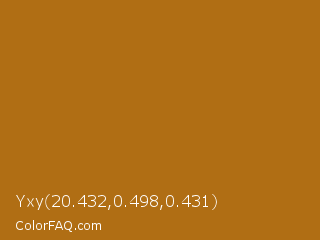 Yxy 20.432,0.498,0.431 Color is a normal orange color and the nearest color is Reno Sand #a86515. Hex code #b06e14 and RGB value is rgb(176,110,20). In RGB color space, this color is composed of 69% red, 43% green, 8% blue, In CMYK color space, this color is composed of 0% cyan, 38% magenta, 89% yellow , 31% black , In HSL color space, this color has a hue angle of 35° , 80% saturation and 38% lightness.