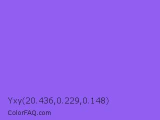 Yxy 20.436,0.229,0.148 Color is a light violet color and the nearest color is Navy Purple #9457eb. Hex code #915ef2 and RGB value is rgb(145,94,242). In RGB color space, this color is composed of 57% red, 37% green, 95% blue, In CMYK color space, this color is composed of 40% cyan, 61% magenta, 0% yellow , 5% black , In HSL color space, this color has a hue angle of 261° , 85% saturation and 66% lightness.