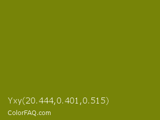 Yxy 20.444,0.401,0.515 Color is a dark yellow color and the nearest color is Olive #808000. Hex code #778408 and RGB value is rgb(119,132,8). In RGB color space, this color is composed of 47% red, 52% green, 3% blue, In CMYK color space, this color is composed of 10% cyan, 0% magenta, 94% yellow , 48% black , In HSL color space, this color has a hue angle of 66° , 89% saturation and 27% lightness.