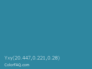 Yxy 20.447,0.221,0.28 Color is a normal cyan color and the nearest color is Astral #327da0. Hex code #2e87a0 and RGB value is rgb(46,135,160). In RGB color space, this color is composed of 18% red, 53% green, 63% blue, In CMYK color space, this color is composed of 71% cyan, 16% magenta, 0% yellow , 37% black , In HSL color space, this color has a hue angle of 193° , 55% saturation and 40% lightness.